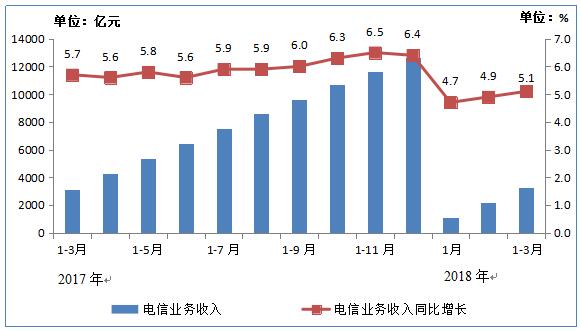 电信业务收入保持稳步增长。2018年1-3月,电信业务总量①完成10999亿元,同比增长121.9%。电信业务收入完成3288亿元,同比增长5.1%。