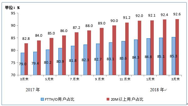 图5 2017-2018年3月光纤接入(FTTH/O)和20Mbps及以上固定宽带接入用户占比情况