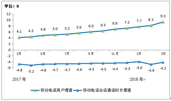 移动电话通话量降幅同比收窄。1-3月,全国移动电话去话通话时长完成6282亿分钟,同比下降4.2%;全国固定本地电话通话时长完成307亿分钟,同比下降19.3%。