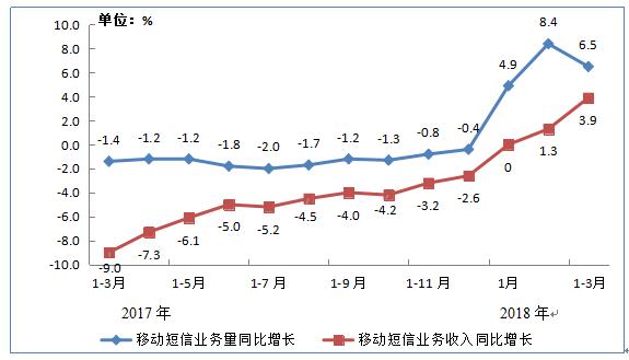 图8 2018年1-3月移动短信业务量和收入同比增长情况