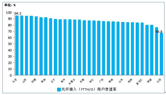 西部光纤接入(FTTH/O)渗透率保持领先。3月末,东、中、西部地区光纤接入(FTTH/O)用户分别达到15056万户、8213万户和7576万户,用户渗透率西部地区领先,达到87.8%,东部、中部地区分别为84.1%和85.3%。各省光纤接入(FTTH/O)用户渗透率差异呈缩小态势,北京、宁夏、山西、河北、西藏、河南、青海、新疆分别居全国前八位,占比均超过90%。