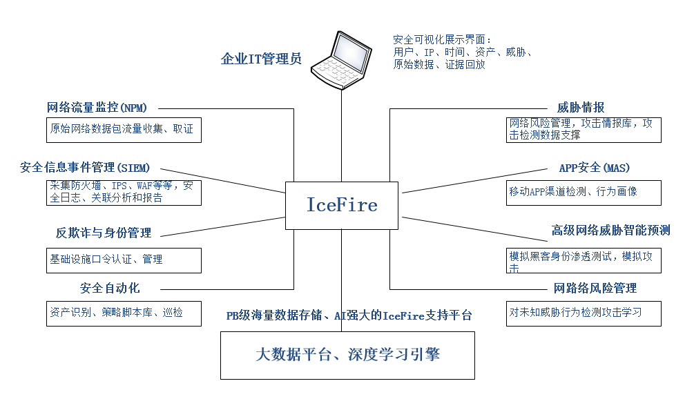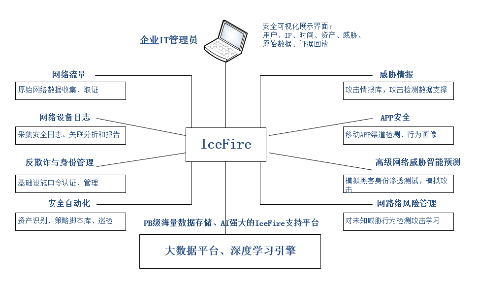 IceFire安全可视化是基于深度学习(DeepLearning)大数据分析平台支撑的,通过全方位的数据采集,关联分析、威胁建模,实现风险态势的主动多维度预测的安全可视化,提高信息安全事件反应速度和程度。