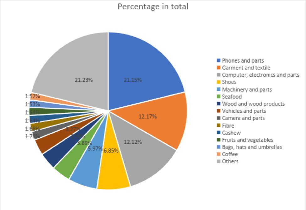 越南出口品类繁多。 依照商品总价值来看,电话、电脑和电子产品,以及服饰鞋履是越南出口最多的商品。