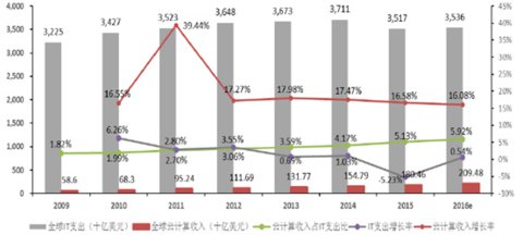 2015 年我国云计算占 IT 支出比重达 9.71%,Gartner 预计在 16 年将达到 15%,09 年至 15 年云计算复合增长率高达 69%,远超同时期我国 IT 支出 8.9% 的复合增长率。我国 IT 支出占 GDP 比例与全球相比偏低。2017 年中国预计在 2.80%,相对于全球 4.58% 的占比还有相当大的提升空间。