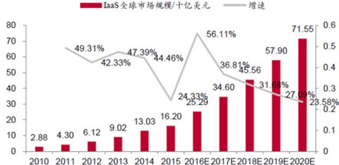 (1)全球 IaaS 市场持续高增长,2015 年 IaaS 市场规模达 162 亿美元,增速 32%(2014 年增速 33%),云主机仍是最主要产品,占据 85% 以上的份额。