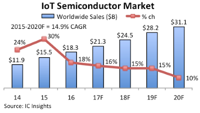 根据IC Insights预测,今年用于实现物联网系统功能的半导体销售总额将达到大约245亿美元,高于去年的213亿美元。该市场研究公司目前正在更新对于IoT芯片销售的预测,但根据去年的估计指出,这一市场将在2020年成长到311亿美元。