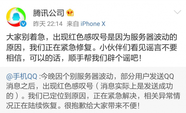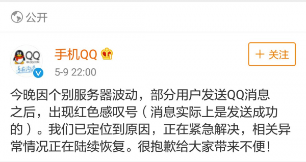 22时,手机QQ官方在微博上发表声明称,是由于个别服务器波动导致用户QQ消息发送后出现红色感叹号,并表示正在紧急修复中。