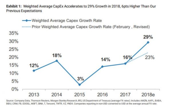 在报告中休伯特指出,由于科技及公司连续将工作内容转移到公共云及缓解硬件限制等因素的共同影响,摩根士丹利预计2018年全球云计算资本支出同比增幅达到29%,与最初预计23%的增幅相比有很大提升。摩根士丹利在分析一季度的数据后,将这一目标大幅上调。
