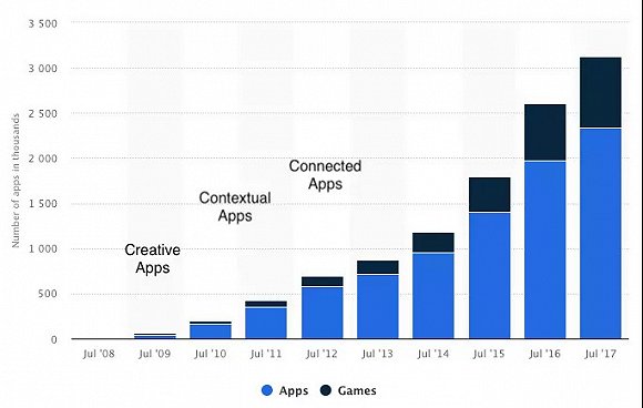 2008年,苹果首次推出了App Store应用商店,当时APP数量接近2万个。而截至2017年底,苹果应用商店的APP数量已高达300多万个。随着苹果ARKit以及谷歌ARCore的推出,增强现实技术(AR)已经在超过5亿台设备上启用。其中苹果App Store上的AR应用数量超过2000个,而Google Play商店的AR应用数量则超过200个。