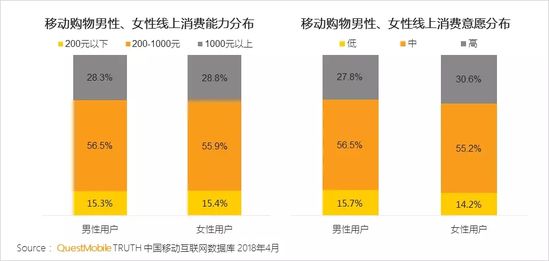 QuestMobile数据显示,移动购物男性线上消费能力并不弱于女性。其中,中上消费能力(高于200元)的男性甚至略高于女性。