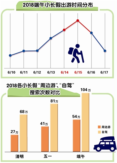 实际上,由于清明、五一小长假结束不久,时间又临近暑期,今年端午节的中国游客出游意愿较前两个小长假有所降低,周边游成为最受游客关注的旅游线路。据搜狗搜索的数据显示,端午相关的“周边游”搜索次数为54万次,“自驾游”的搜索次数为104万次,搜索量均远远超过清明和五一小长假。