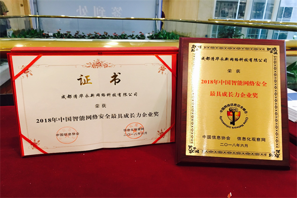2018年6月6日,2018(第三届)中国网络信息安全大会在北京新世纪日航酒店举行,大会由中国信息协会举办,旨在发现当今网络安全领域存在的迫切需求、技术问题和产业发展问题,找出解决之道,进一步推动中国网络安全产业的健康发展。成都清华永新网络科技有限公司作为智能网络安全领域的佼佼者应邀参加,并凭借在智能网络安全领域的创新以及取得的出色成绩,在众多奖项候选企业中脱颖而出,荣膺“中国智能网络安全最具成长力企业奖”。