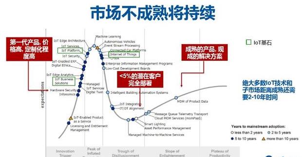 从Gartner的产品成熟度曲线来看,绝大多数物联网技术还处于第一代产品阶段,价格高、标准化程度低,真正采用的客户还很少。进入到成熟阶段的物联网技术则非常少。整体来看,绝大多数物联网技术还需要5年,甚至10年才会逐步成熟。