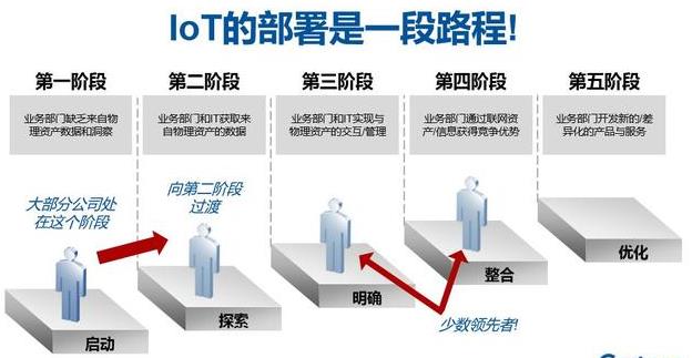 下图是物联网部署的五阶段,是按成熟度来划分的。目前,绝大多数部署了物联网应用的企业处于第一阶段,逐步开始向第二阶段过渡,只有极少数企业进入到第三、第四阶段。