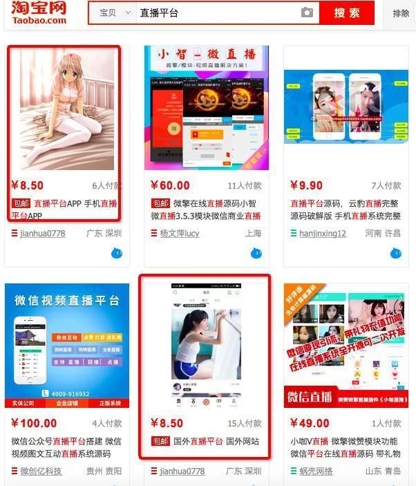 2017年至今,主管部门对“涉黄”直播平台的查处也持续高压,诸多违法app及平台被惩治。记者在淘宝搜索“直播平台”,多个有暗示性的商品呈现在首页,记者随机点入一个,客服提出转移到qq详谈,然后推销。记者付款后,店家发来一款名为“小姐姐”的app链接,里面充斥着大量低俗、裸露的两性直播。