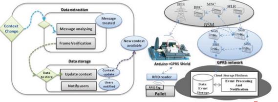 二、使用的技术和建模方法:概述1、现有平台我们已经在日常生活的许多领域(农业/畜牧业、货物运输/贸易、环境、健康)提出了各种协作平台。从架构的角度来看,我们可以说这些平台主要基于协作门户网站的模型,在集成方面,这些系统可以分为三类:点对点模型,通过Web服务进行集成(使用SOAP、UDDI、HTTP、WSDL等标准),以及基于中间件(RPC、CORBA、DCOM、MOM)。这些体系结构的一个重要限制是它们不包括用于从传感器获取信息的传感器网络(WSN),这些传感器很少有云计算数据存储策略(基于NoSQL,云存储,AWS)。此外,就我们所知,在这些体系结构中很少提及通知和实时事件的概念处理。增加未来协作系统所需的集成问题,例如需要共享资源管理的共同策略,各种系统特有的协议和格式的多样性,以及从任何设备(PC、PDA等)与任何平台(Windows、IOS、Android等)可访问性。2、物联网物联网是计算机技术和通信的一种发展,旨在通过互联网连接物体。对象指的是我们周围的一切,可以沟通或不沟通。这些对象互连所产生的信息和事件流被捕获,用于促进他们的追踪,管理,控制和协调。物流对象和流程是一个具体的应用例子。3、RFIDRFID由一对读卡器/标签组成。阅读器发送无线电波,标签依次发送识别帧。芯片启动后,标签和标签将按照TTF协议(Tag Talk First)或ITF(Interrogator Talk First,询问器优先级)进行通信。以TTF方式,标签将芯片中包含的第一个信息传送给询问器。在ITF模式下,询问器向标签发送一个请求,并在稍后满足。有三种类型的标签,无源标签、主动和半主动。前者的能量由识别时由读者引起的磁场提供。有源标签由电池供电,并且能够在没有来自阅读器的请求的情况下发送数据。半主动标签使用混合机制:自供电,根据标签阅读器的要求激活,允许比有源标签更低的功耗。RFID芯片的阅读距离从几厘米到几米(10米)不等,可以使用远程通信技术超过200米。4、协作供应链的数据和信息共享传统的供应链和业务管理系统有很多缺陷,因为供应商在客户订单和市场需求方面没有全球可见度。 需求驱动的供应网络(Demand Driven Supply Networks ,DDSN)是一种支持企业对企业协作和互操作性的IT方法。 DDSN建议在公司间供应链上分享数据。通过采用这种方法,而不是单独回应孤立的客户订单,供应商能够通过共享更多数据进行重组和共同工作,以便更好地应对所有市场需求。DDSN使用拉动技术,即供应链由客户需求通过反应,预测、协作和编排来驱动,例如根据具体情景,库存水平大约为8%,可能高达30%,而可靠的信息共享可以降低OOS率(out of stock situations)并改善需求链管理。5、GSM框架两种方法共存于业务流程模型中,以流程为中心的方法和以事件为中心,在以流程为中心的方法中,业务流程由在流程生命周期中执行的各种处理或任务来表示。最有前途的方法是以工件为中心,将业务实体生命周期与被捕获的实体相关数据信息模型相结合。