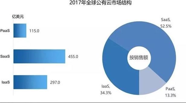 赛迪顾问最新发布的《2017-2018年中国云计算市场研究年度报告》指出,软件即服务(SaaS)仍是全球公有云服务市场最大的细分市场,2017年市场规模达到455亿美元。