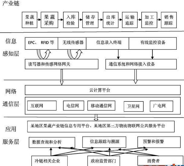 应用层解决的是信息处理与人机界面的问题, 网络层传输来的数据在这一层进入各类信息系统进行处理, 并通过各种设备与人进行交互。首先应当了解果蔬冷链物流行业人员的需求, 从需求出发了解系统应该提供那些服务。关注果蔬冷链物流品质的主要成员有:政府监管部门、冷链相关企业和最终消费者。作为政府监管部门, 承担着监督、管理和控制果蔬品质的职责, 他需要了解果蔬冷链流通中全部信息, 物联网技术需要满足政府监管部门随时了解到信息, 并能提供与冷链物流企业沟通交流的平台;作为冷链相关企业, 首先要掌握各时间点果蔬冷链的动态信息, 其次要将这些信息通过物联网平台及时共享给上下游企业, 实现果蔬流通信息高效传递, 确保流通中每个环节畅通;作为果蔬的最终消费者, 他们最关注的是果蔬的安全和新鲜度, 购买果蔬时可以实现全程可追溯信息, 达到放心购买的目的。
