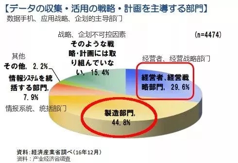 日本经济产业省(日本政府组成部门——译者注)发行的《基础制造业白皮书》2017版问卷调查部分,针对“应由哪个部门负责制定数据采集和应用方面的战略及规划”进行了提问,答案最多的是“制造业部门”。实际上,制造业主导此类规划数量占比达到44.8%,侧面反映出日本国内当前制造业物联网发展以“工厂互联”化为中心。