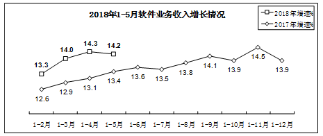 软件业务收入稳步增长。1-5月,我国软件和信息技术服务业完成软件业务收入23328亿元,同比增长14.2%,增速同比提高0.8个百分点。其中5月当月增长14.2%,增速低于4月0.9个百分点。