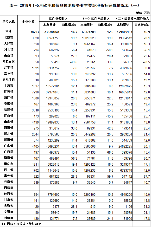 2018年1-5月软件和信息技术服务业主要经济指标完成情况表(一)