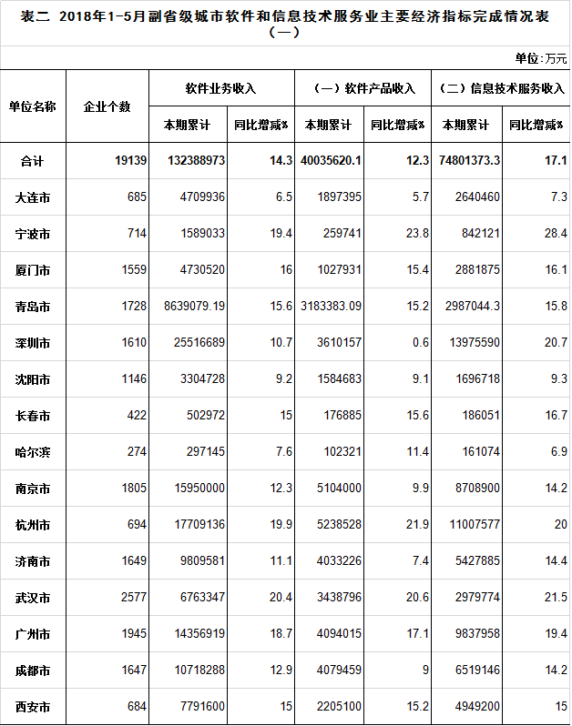 2018年1-5月副省级城市软件和信息技术服务业主要经济指标完成情况表(一)