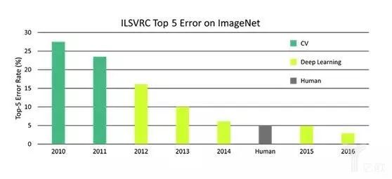 8年的时间里,在ImageNet挑战赛中,计算机对图像分类的错误率降低了10倍。