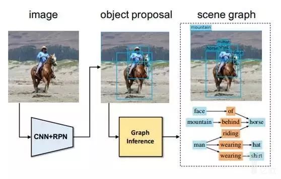 所以我们下一步的工作,就是希望能够出现自动地产生场景图的一个技术。所以我们在今年夏天发表的一篇 CVPR 文章中做了这样一个自动生成场景图的方案:对于一张输入图像,我们首先得到物体识别的备选结果,然后用图推理算法得到实体和实体之间的关系等等;这个过程都是自动完成的。