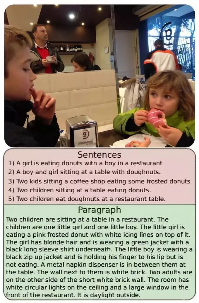 除了此之外,我们今年所做的工作迈上了一个新的台阶,计算机面对图像不只是简单的说明句子,还要生成文字段落,把它们以具有空间意义的方式连接起来。这与认知心理学家所做的实验当中人类的描述结果是非常接近的。