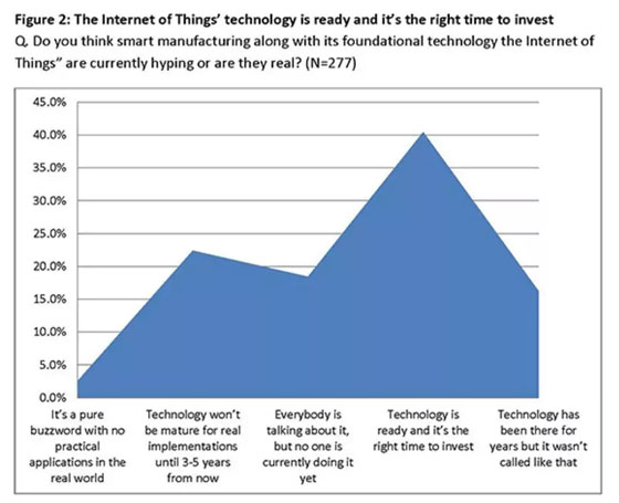 世界各地的制造商现在都有信心。大约40%的受访者认为,智能制造及其基础技术 - 物联网已经准备就绪,现在是投资的正确时机(图2)。 只有3%的人将智能制造和物联网视为纯粹的流行语。