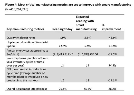 在我们的实地调查中,我们也询问了智能制造业的预期业绩结果,并发现了很高的期望。质量,正常运行时间,库存效率等方面的收益预计将达到两位数的百分比(图4)。