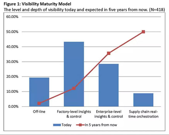 转变是巨大的。 SCM World最近对智能制造和物联网进行的实地调查发现,尽管今天五分之一的人承认他们的工厂业务完全“脱网“,但五年后这一数字将降至接近于零。事实上,根据SCM World的可见性成熟度模型(图1),接受调查的所有制造业高管中有一半人希望在本单位层面的供应链中具有可见性。只有10%的人预测他们仍然仅限于单一的工厂级别的了解和控制。