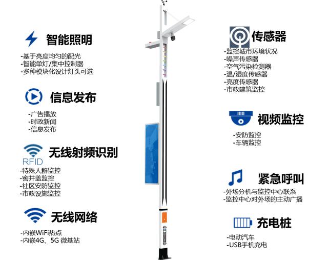 目前的智慧路灯已经可以实现照明、信息发布、监控、无线网络、充电桩、紧急呼叫等功能。