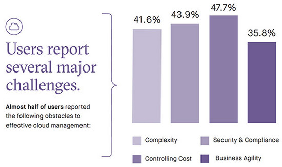 当被问及在云计算的应用中遇到的挑战时,IT专业人士表示最大的挑战是控制成本(48%),其次是需要确保基础设施安全性和合规性(44%),以及管理日益增长的云计算的复杂性(42%),并满足业务敏捷性的需求(36%)。