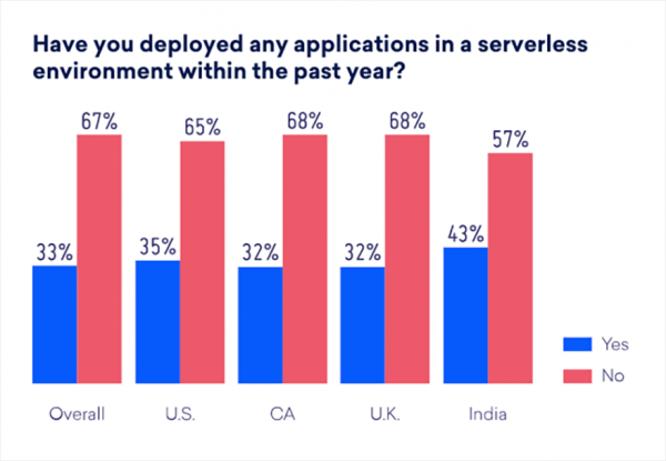 当被问到他们在去年是否使用过无服务器应用程序时,结果不出预料,约有三分之二的人说他们没使用过。各个地区的情况基本一致,唯有印度的无服务器使用率较高。