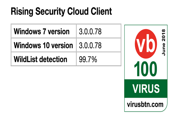 近日,国际权威杀毒评测机构Virus Bulletin公布了2018年6月VB100评测成绩。报告显示,瑞星安全云终端顺利通过测试并获得VB100认证,这不仅是对瑞星杀毒软件的认可,更是证明了瑞星杀毒能力的国际化水准。