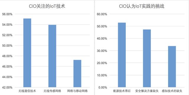 在物联网实践过程中,技术是第一实践路径。数据显示,55.1%的CIO关注无线通信技术,53.9%的CIO关注无线传感网络,47.2%的CIO关注网络与移动网络。