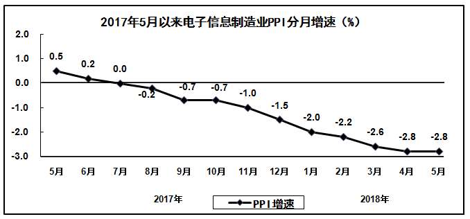 1-5月份,电子信息制造业生产者出厂价格同比下降2.5%。5月份,电子信息制造业生产者出厂价格同比下降2.8%,延续去年三季度以来的下降趋势;环比基本持平。