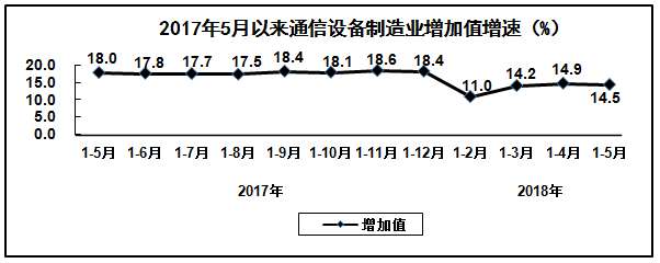 1-5月份,通信设备制造业增加值同比增长14.5%。主要产品中,手机同比增长3.8%,其中智能手机同比增长5.9%。出口交货值同比增长15.0%。
