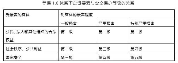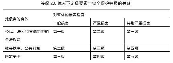 《等保条例》继受了《管理办法》所确立的五级安全保护等级体系,但进一步强化了对公民、法人和其他组织合法权益的保护。《管理办法》并未在主文中规定当遭受破坏后会对公民、法人和其他组织合法权益产生特别严重损害的信息系统应当如何定级,《定级指南1.0》仅在之后定级要素与安保等级关系的表格中显示上述信息系统应列为第二级,而《等保条例》则进行了相应修改,当等级保护对象受到破坏后,会对公民、法人和其他组织的合法权益产生特别严重损害时,相应系统应当定为第三级保护对象。具体等级划分请参照以下表格: