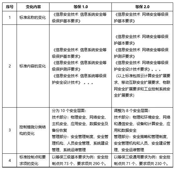 近年来,随着人工智能、大数据、物联网、云计算等的快速发展,安全趋势和形势的急速变化,2008年发布的《GB/T22239-2008 信息安全技术 信息系统安全等级保护基本要求》(简称等保1.0)已经不再适用于当前安全要求。从2015年开始,等级保护的安全要求逐步开始制定2.0标准,包括5个部分:安全通用要求、云计算安全扩展要求、移动互联安全扩展要求、物联网安全扩展要求、工业控制安全扩展要求。2017年8月,公安部评估中心根据网信办和安标委的意见将等级保护在编的5个基本要求分册标准进行了合并形成《网络安全等级保护基本要求》一个标准。等保1.0标准更偏重于对于防护的要求,而等保2.0标准更适应当前网络安全形势的发展,结合《网安法》中对于持续监测、威胁情报、快速响应类的要求提出了具体的落地措施。等保2.0与等保1.0标准的变化内容请参照以下表格: