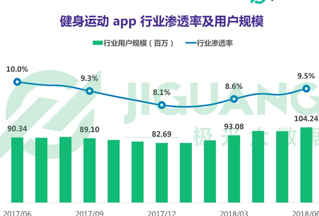 极光大数据的统计结果显示,从去年6月份起,健身运动app的渗透率开始逐步下滑,在今年1月份触底后开始回升。截至今年6月份,健身运动app的行业渗透率为9.5%,用户规模达到1.04亿。