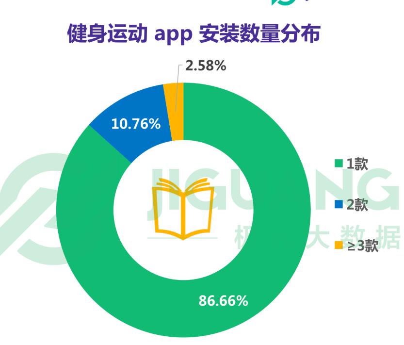 根据极光大数据的统计结果,有86.66%的用户倾向于只在设备上安装1款健身运动app,安装2款的用户占比为10.76%,只有2.58%的用户安装数量达到3款及以上。对于大部分用户而言,1款健身运动app似乎已经能够满足日常生活中的健身运动需求。