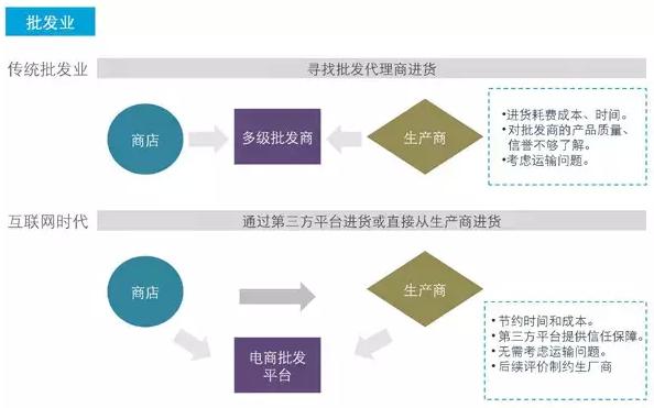 2、在互联网繁荣到一定程度后,中间代理批发商的角色会逐渐消失,更多直接是B2C的取代。