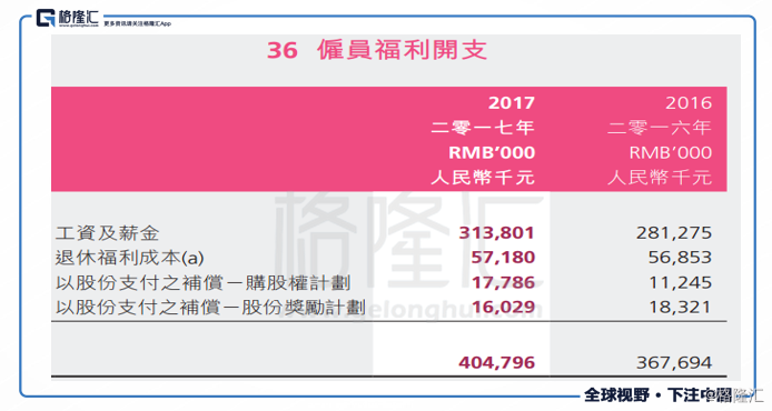 同时,为了调动集团高管及员工的积极性,无论是郭江和刘军都用了很大心思。此次高管的股权激励方案可以看出,刘军在此方面从不吝啬。同时,员工们的福利待遇也在不断提升,虽然2017年的员工人数明显减少,但总福利待遇包括购股权及股份奖励计划却有增无减。