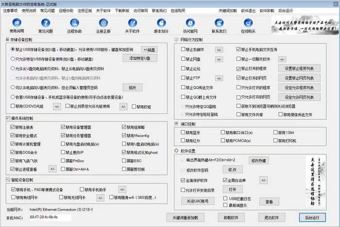 例如有一款“大势至电脑文件防泄密系统”,不仅可以有效禁止U盘等禁用USB存储设备,而且还可以只让从U盘向电脑复制文件而禁止从电脑向U盘复制文件,或者向U盘复制文件必须输入密码,从而有效地保护了电脑文件安全;同时,系统还可以禁止电脑发送邮件、只让使用公司信箱收发邮件、只让电脑接收邮件而禁止发送邮件;禁止网盘上传电脑文件、禁止FTP文件上传以及禁止QQ发送文件等,防止通过网络途径泄密电脑文件的行为。同时,大势至公司数据防泄密系统的操作使用极为简单,所有功能模块集中在一个软件界面上,点点鼠标就可以启用,适合所有网管人员。如下图所示:
