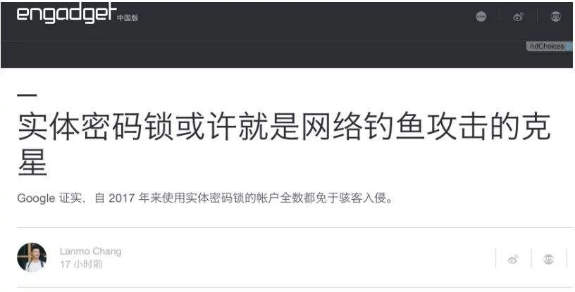 Engadget中国昨天报道了Google 内部要求85000 名员工使用实体安全密码锁取代传统密码作为身份认证手段的新闻(2017年便开始),也指出像Yubikey这类第三方机构出品的实体密码锁也开始支持chrome、firefox等浏览器了。