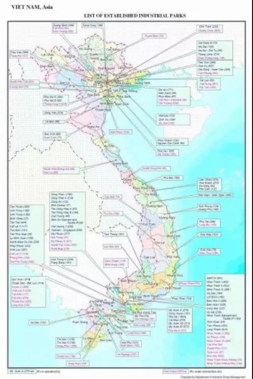 从这张地图可以看出,越南的工业园区从最北端到南端排成一排。 大多数工业园区都分布着从事不同行业的多样化企业。