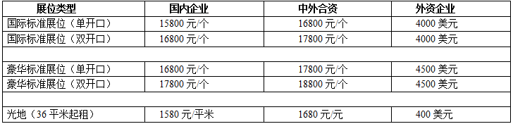 备注:1、标准展位(规格:3M×3M),包含三面展板、洽谈桌椅、两个射灯、220V/5A电源插座、地毯及公司名称楣板;2、特装光地(36平米起租),光地不提供任何展览设施,光地管理费和电源费自理。