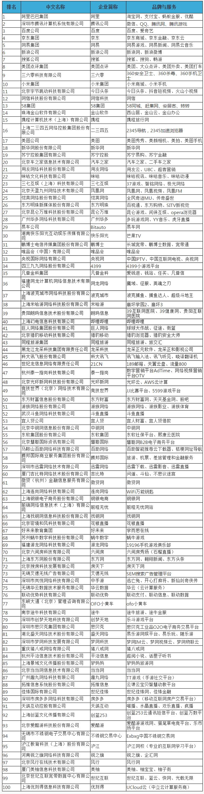 2018年7月27日,中国互联网协会、工业和信息化部信息中心在2018年中国互联网企业100强发布会暨百强企业高峰论坛上联合发布了2018年中国互联网企业100强榜单和《2018年中国互联网企业100强发展报告》,阿里巴巴集团、深圳市腾讯计算机系统有限公司、百度公司、京东集团、网易集团、新浪公司、搜狐公司、美团点评集团、三六零科技有限公司、小米集团位列榜单前十名。